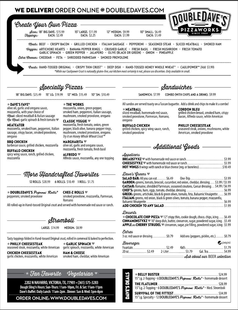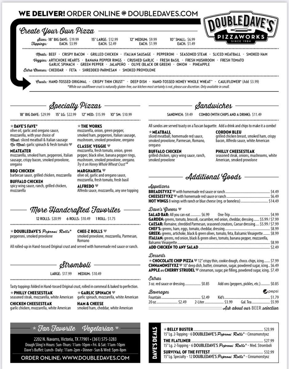 Welcome to DoubleDave's Pizzaworks Victoria, a delightful pizza haven located at 2202 N Navarro St, Victoria, TX. Known for its warm ambiance and exceptional service, this pizzeria promises a memorable dining experience. Customers rave about the buffet, which offers a constant rotation of fresh pizzas, ensuring you never have a dull bite.